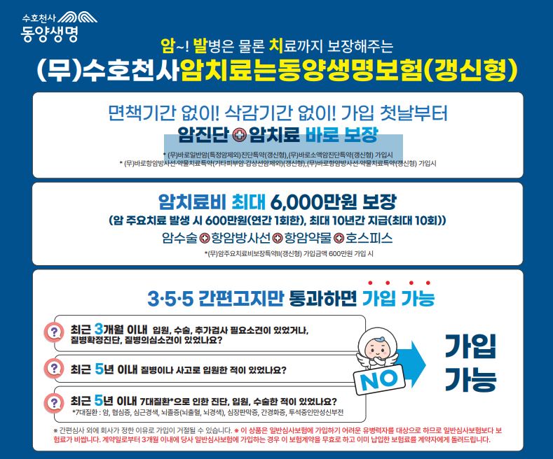 이번 시간에 소개해드릴 상품은 수호천사 암치료는 동양생명보험입니다.