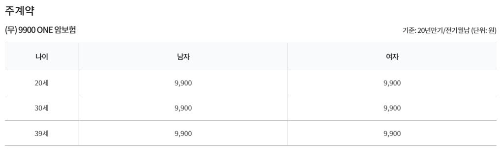 라이나생명 9900won암보험의 경우 모든 가입자의 보험료가 9900원으로 동일하지만, 가입자분의 연령이나 성별에 따라서 보장금액과 가입금액이 달라집니다.
