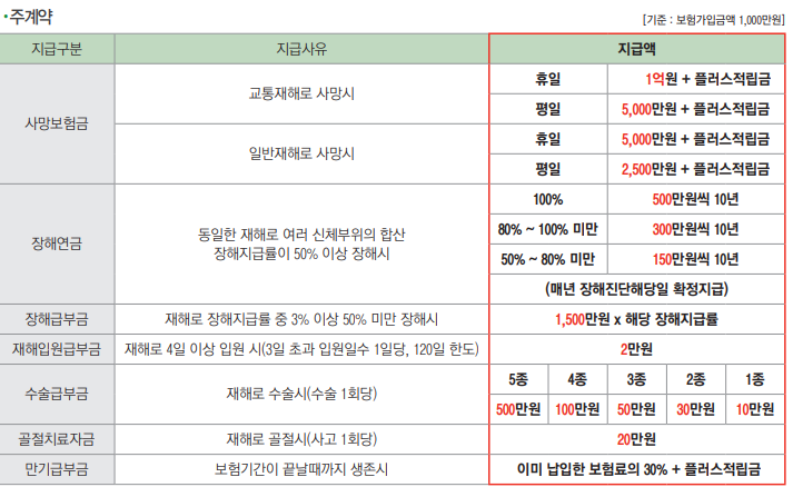 -일반재해로 사망시 휴일 5천만원, 평일 2500만원 보장