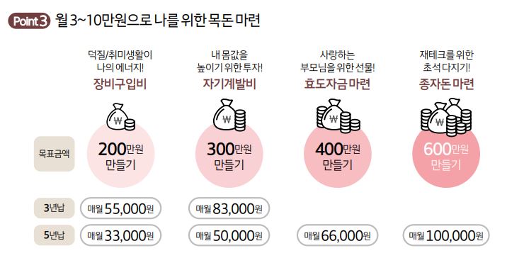 중간에 포기를 하시더라도 한달만 유지해도 원금이상 보장이 되며, 매월 3만원~10만원 이내의 금액이기 때문에 누구나 쉽게 시작하실 수 있습니다.