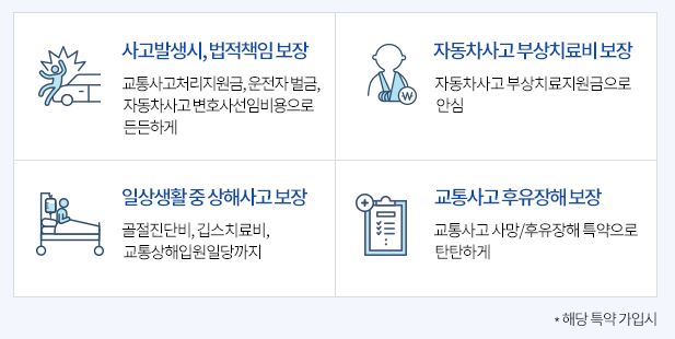 -자동차사고 부상치료지원금, 차대차 자동차사고시엔 추가보장, 골절진단비, 응급실내원비 등