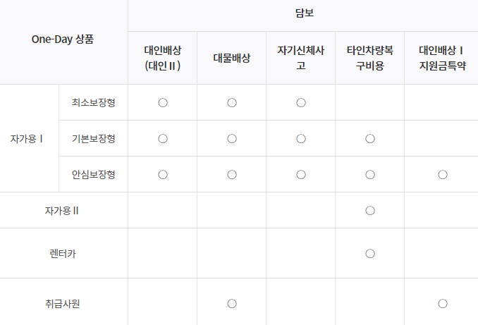 -타인차량복구비용: 1사고당 차량가액한도(자부담 50만), 원데이자가용 최고 3천만, 원데이렌터카 최고 1천만원