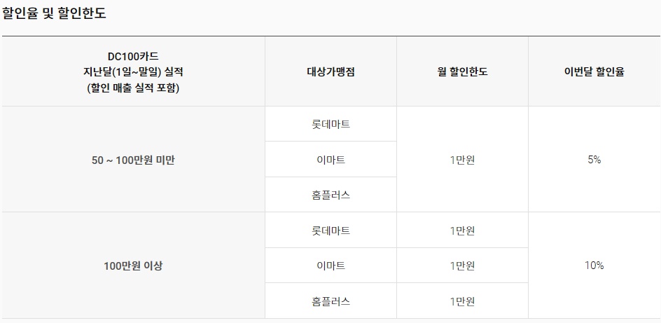 -'DC100 카드'의 지난달(1일~말일) 이용 실적 기준으로 이번달(1일~말일) 할인율 및 한도 확정