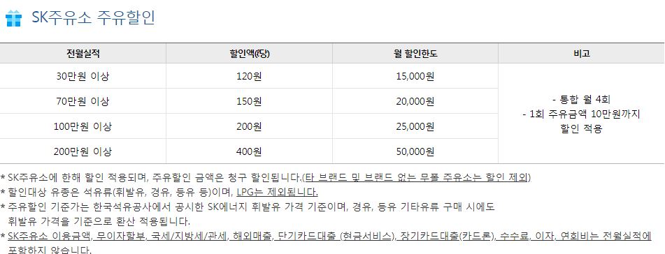 전월 사용실적에 따라서 할인금액이 달라지게 됩니다. 30만원 이상일 경우 120원, 70만원 이상일 경우 150원, 100만원 이상일 경우 200원, 200만원 이상일 경우 400원의 할인을 받을 수 있구요. 월 할인한도나 1회 주유금액 제한 월 4회 제한등의 기타 조건도 있습니다.