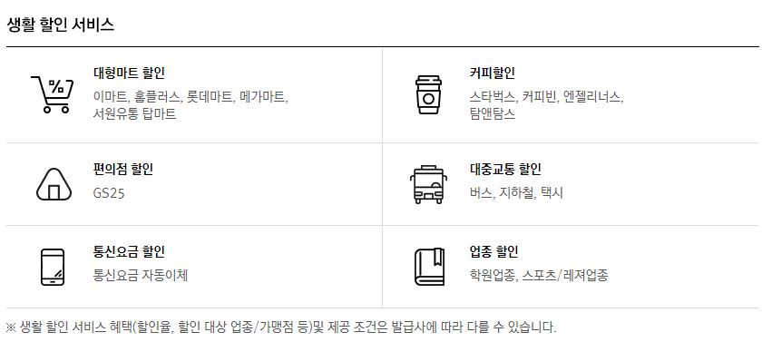 주유할인 이외에 생활속에서 받을 수 있는 할인 서비스도 한번 살펴보면, 대형마트 할인, 커피전문점할인, 편의점할인, 대중교통할인, 통신요금 자동이체할인, 업종할인 등이 있습니다. 이 할인 조건은 발급사에 따라서 조금씩 달라질 수 있다고 하는데요.