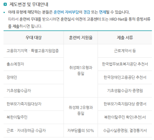 먼저 총 비용은 46만1,760원으로 책정이 되어 있는데 일반훈령생은 자부담이 16만1,620원, 취업성공패키지Ⅰ 유형은 0원, 취업성공패키지Ⅱ유형 참여자는 13만 8530원, 근로장려금 수급자 유형은 9만2360원이면 교육을 받으실 수 있답니다.