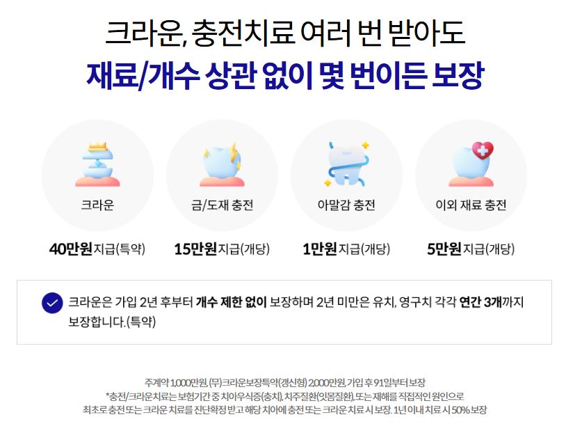 가장 먼저 확인해야 할 것은 보장 범위입니다. 임플란트, 브릿지, 틀니 같은 보철치료가 보장되는지, 크라운이나 충전치료 같은 보존치료가 포함되는지 살펴봐야 합니다.