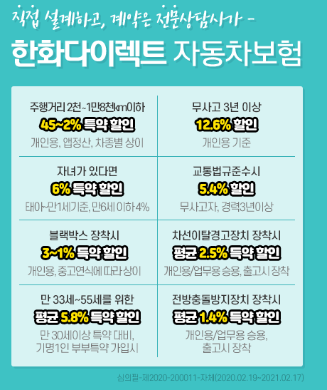 한화 다이렉트 자동차보험 주행거리 블릭박스 무사고 할인율 (0) | 2021.06.03 |