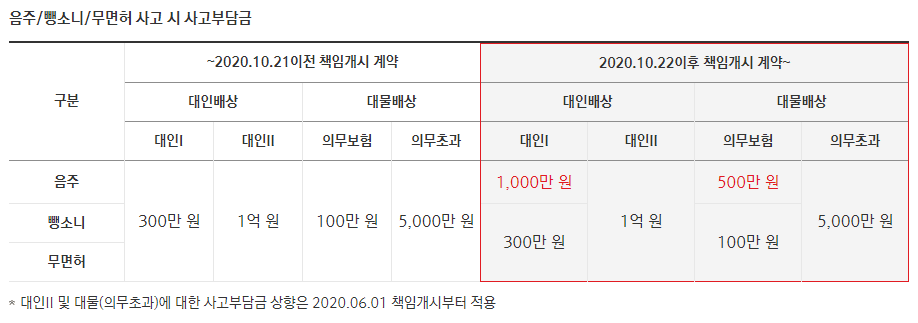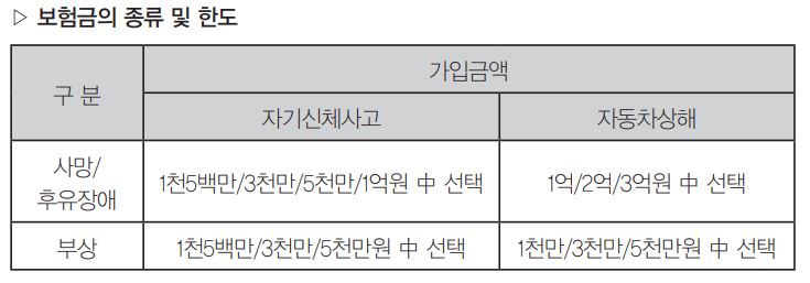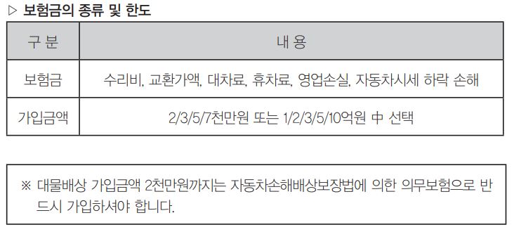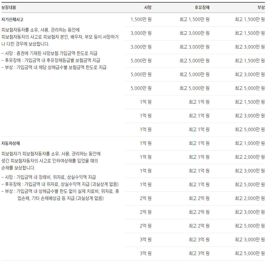 1사고당 10억, 5억, 3억, 2억, 1억, 7천만원, 5천만원, 3천만원, 2천만원 중 1가지를 택하실 수 있으며, 업무용 승합 1,2종, 화물1.2.3종, 건설기계, 특수작업용/특정용도자동차는 5억원, 10억원을 가입하실 수 없습니다.