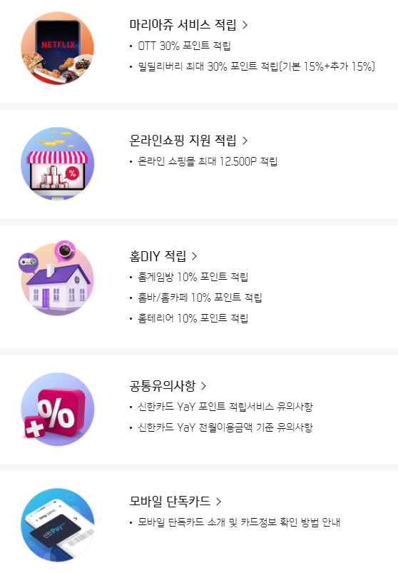 온라인쇼핑이나 넷플릭스, 유투브 등을 자주 이용하시는 분들은 그에 걸맞는 신한카드 YaY를 한번 참고해 보시기 바랍니다.